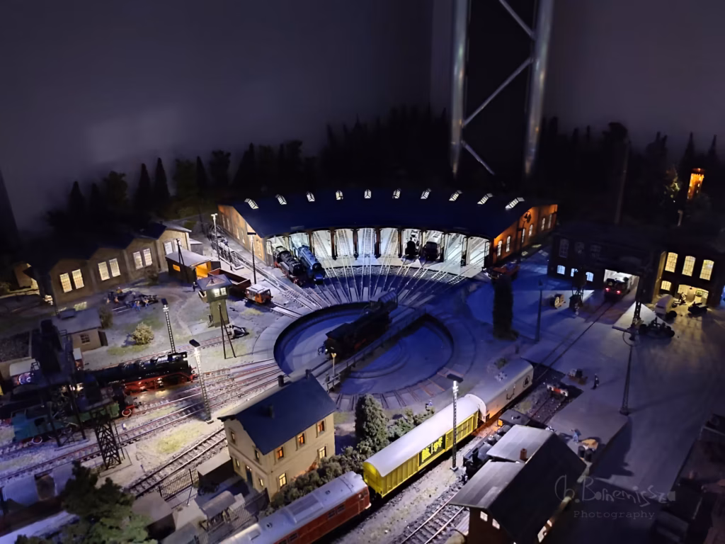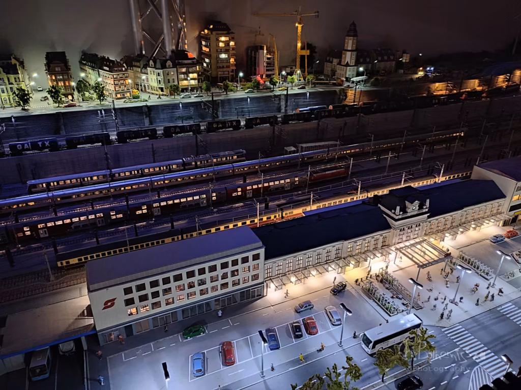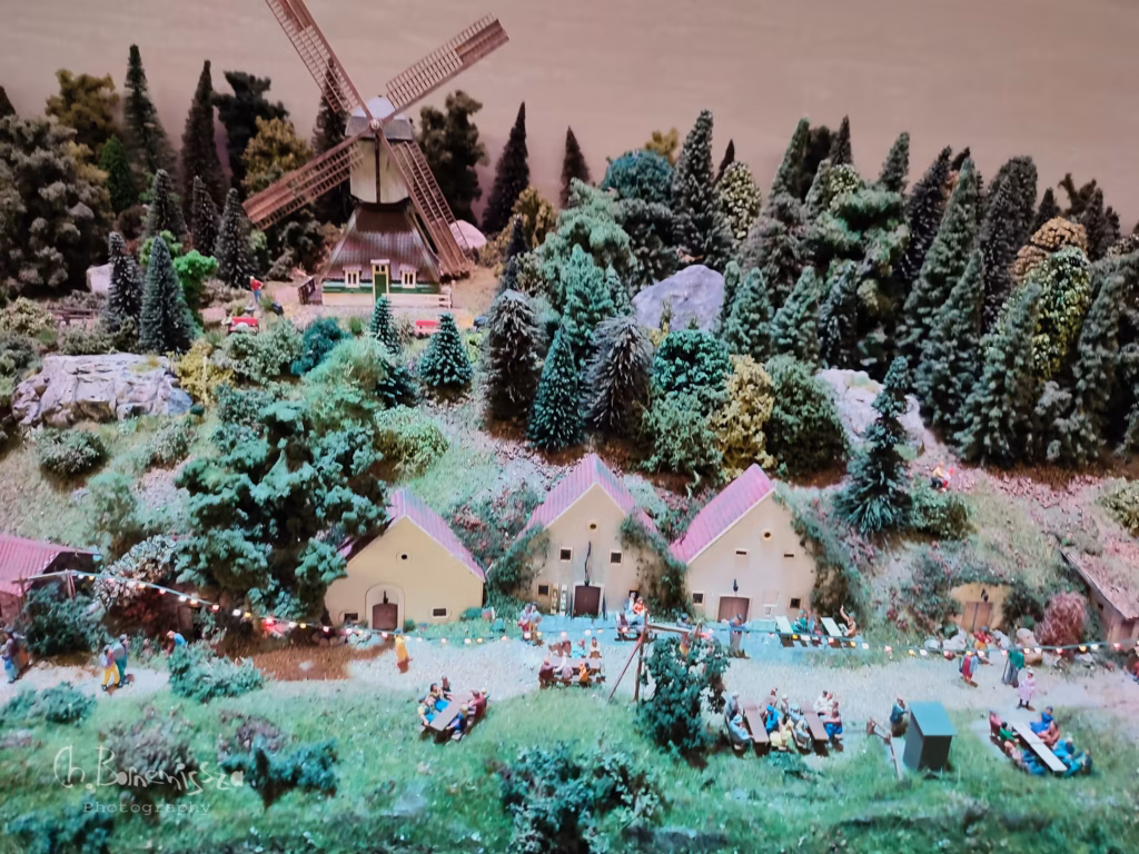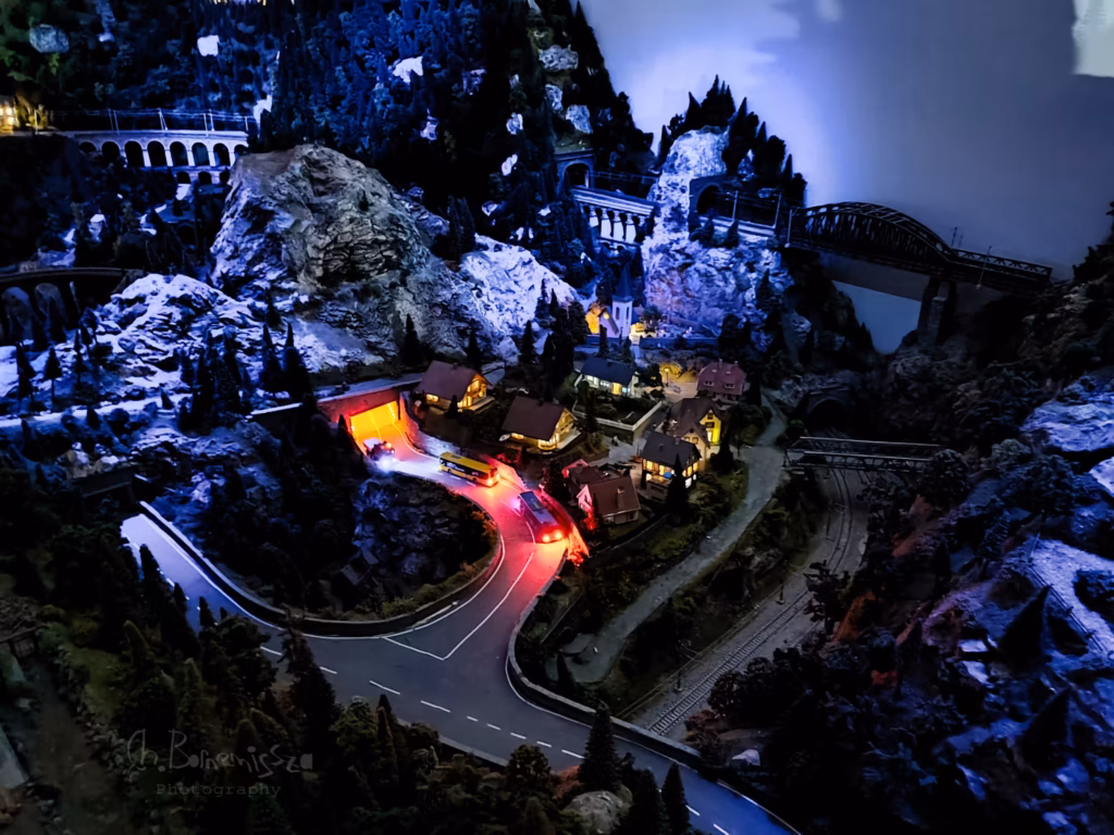 Was uns besonders fasziniert hat war die Tag-Nacht-Steuerung. Mit ihr lässt sich die ganze Anlage in nur 24 Minuten durch einen ganzen Tag steuern – von Sonnenaufgang bis Sonnenuntergang. Dazu verleiht dann die stimmungsvolle Beleuchtung der Anlage eine ganz besondere Atmosphäre. In der Nacht kann man zum Beispiel in die beleuchteten Häuser hineinschauen und überall blinkt und flackert es in den Straßen. Überall entdeckt man kleine liebevoll gestaltete Szenen. Wir waren total begeistert. Ein absoluter Tipp und unbedingt anschauen!