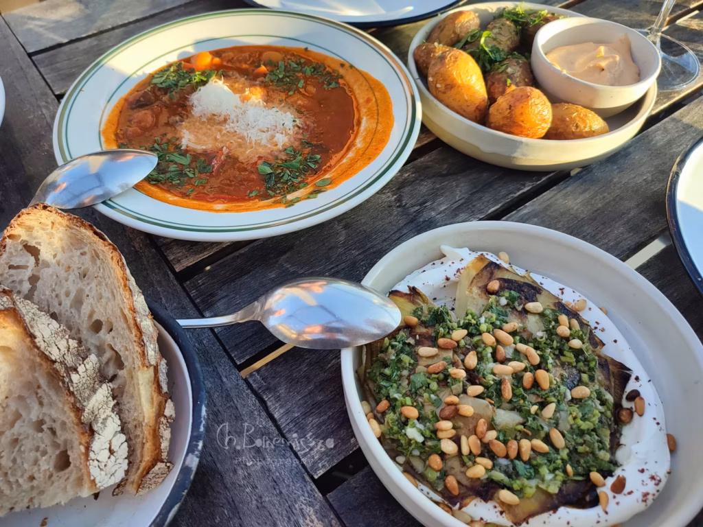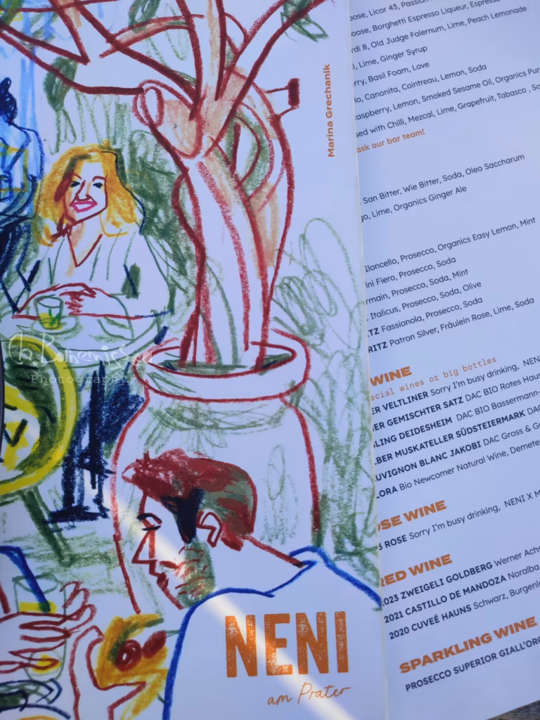 Aber jetzt war es an der Zeit zum Lokal zu gehen und Hunger hatten wir auch schon alle. Das Neni befindet sich in einem Hotelkomplex im 7.Stock und das Highlight ist definitiv die Dachterrasse. Es ist ein modernes und hippes Lokal. Es gibt leckeres israelische Essen nach dem Sharing-Konzept mit netter Bedienung und echt gutem Wein. Man sollte schon vorher reservieren, um auch garantiert einen Platz zu bekommen. Wir hatten echt ein Glück und haben in erster Reihe mit freiem Blick auf den Prater einen Tisch bekommen. Da haben wir es uns gut gehen lassen und die Gerichte waren echt super lecker. Und während wir uns dort das Essen schmecken ließen und miteinander quatschten, ging die Sonne unter. Mit Blick auf das bunte Treiben des Praters und der Dämmerung, die langsam über die Stadt zog, wurde der Abend zu einem kleinen Schauspiel. Die Sonnenstrahlen verabschiedeten sich mit dem letzten warmem Licht und der Prater hüllte sich in das Funkeln der Neonröhren, die das nächtliche Treiben der Stadt widerspiegelten. Immer wieder hörte man ganz leise das Aufschreien der Menschen und das Poltern der Achterbahnen. Alles wirkte lebendig und leicht. Wie ein kleines und fröhliches Theaterstück unter freiem Himmel.
